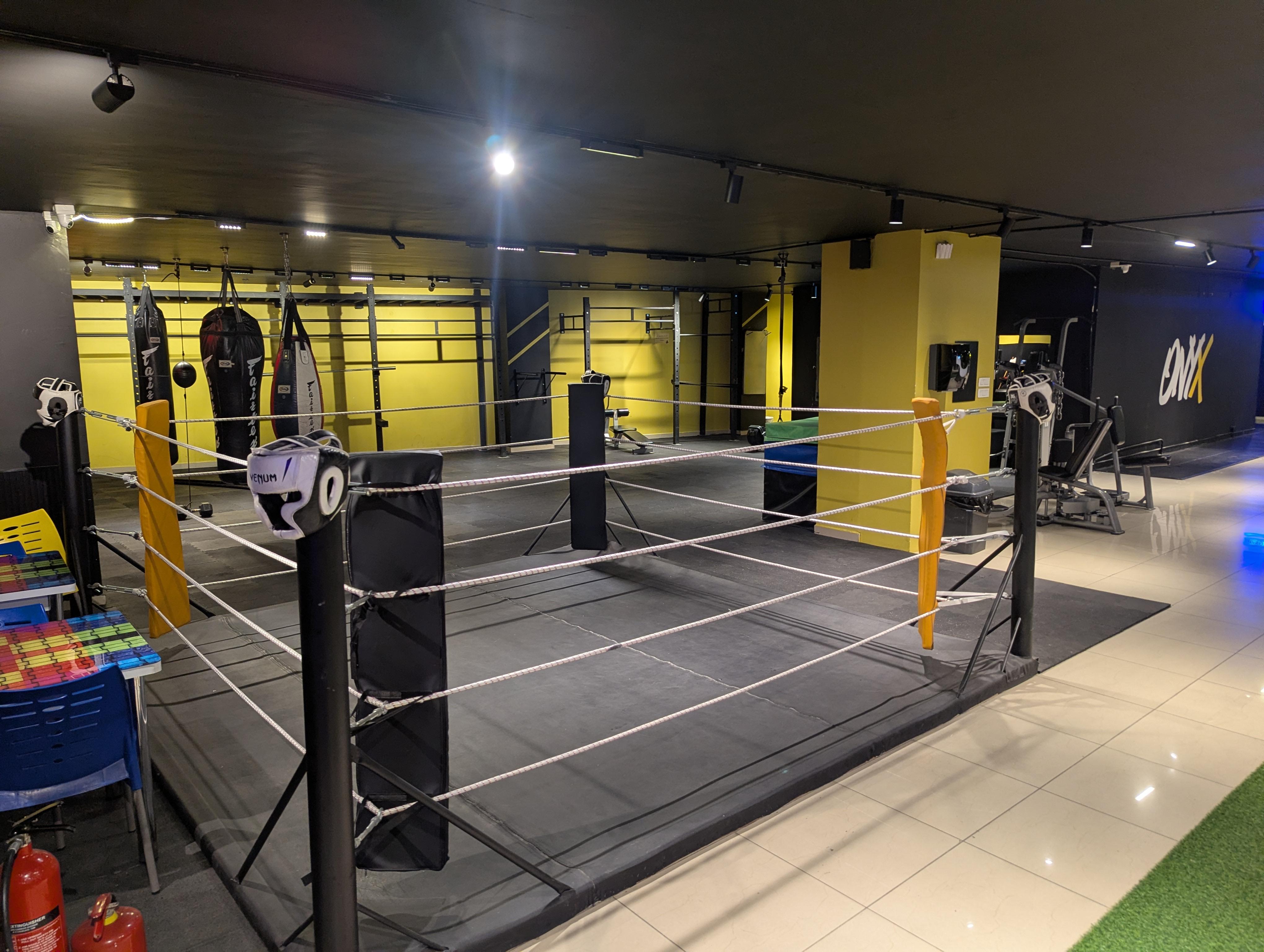 Full-size boxing ring, heavy bags, speed bags, and pad work space. Built for serious boxing and combat sports training.