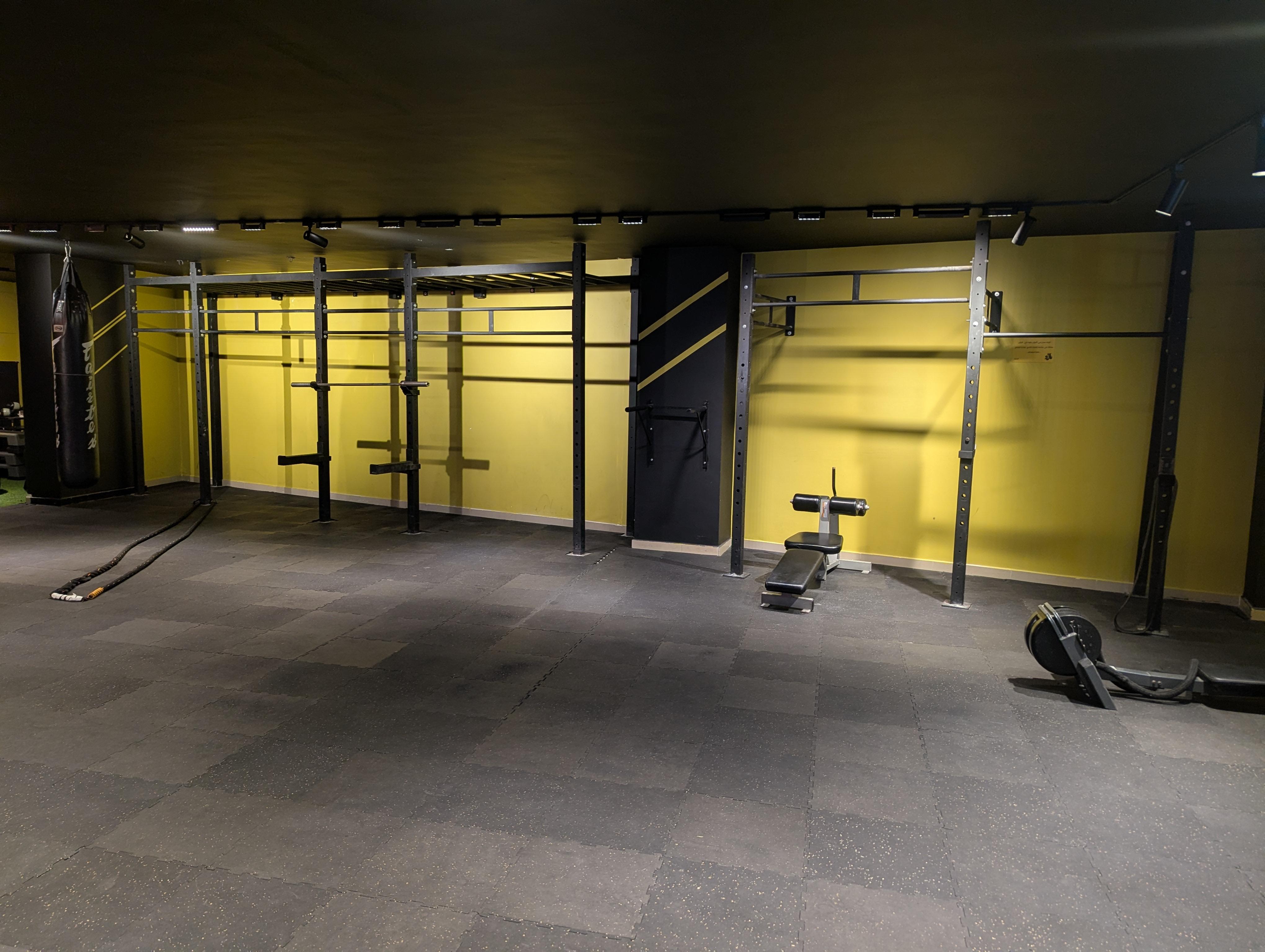 Open matted floor for movement work, wrestling, grappling, shadowboxing, and freestyle training. No machines in the way.
